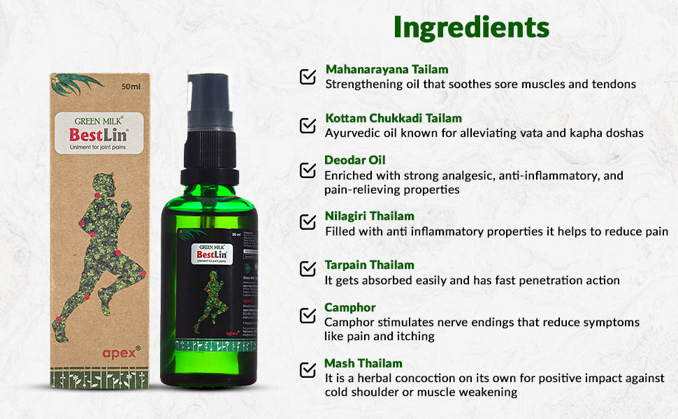 GreenMilk Concepts Pain Relief products are formulated using time-tested Ayurvedic oils and herbal ingredients known for their soothing properties. Our range combines traditional formulations like Mahanarayane Thailam, Gandhapura Thailam, Nilgiri Thailam, and Camphor to support joint flexibility, ease muscle stiffness, and promote everyday comfort. The products are designed for fast absorption, effective relief, and regular use without heavy, greasy residue.