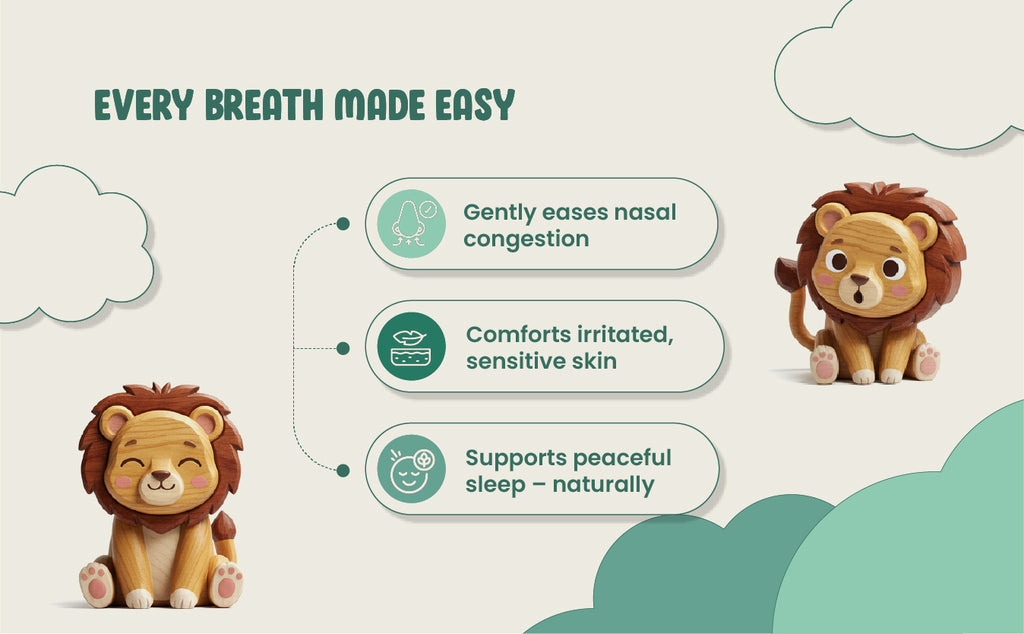 Unlike regular vapour rubs, this baby balm is mild, free from strong fumes or synthetic fragrances. It absorbs smoothly into baby’s chest, neck, back, and soles, creating a calming bedtime ritual for parents and babies alike.