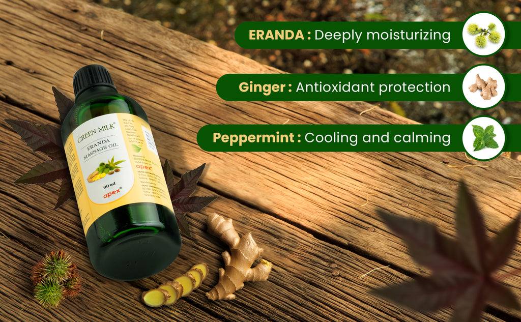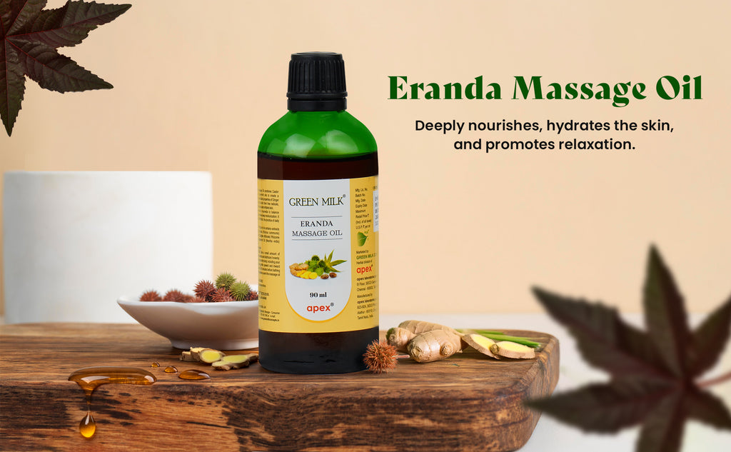 Inspired by classical Ayurvedic formulations, Green Milk Eranda Massage Oil is a rich body and massage oil crafted for daily self-care and relaxation.
