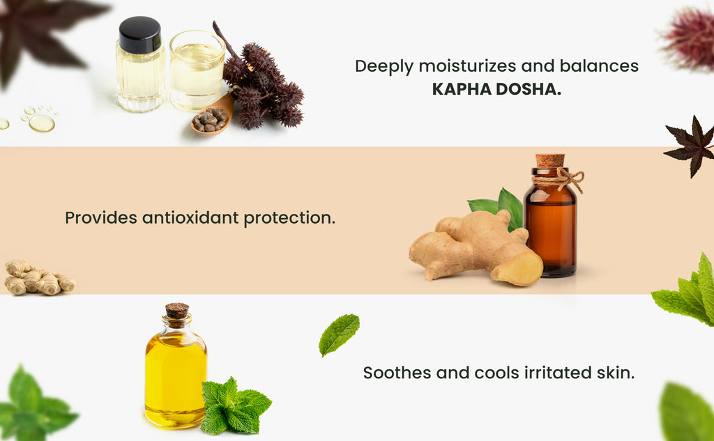 This Ayurvedic massage oil combines Eranda (Castor seed oil) with Sunthi (Ginger) and Pudinah (Peppermint oil) to create a balanced, nourishing blend. In Ayurveda, Eranda oil is traditionally used for deep moisturisation and Kapha balance, making it ideal for dry, tired skin. Ginger oil provides antioxidant support to help protect the skin from daily environmental stress, while Peppermint oil offers a cooling, soothing sensation during massage.
