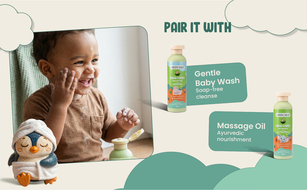 Dry skin can make babies uncomfortable, itchy, and fussy. That’s why Green Cuddle Moisturizing Baby Lotion is carefully crafted to deliver gentle hydration with a loving Ayurvedic touch.