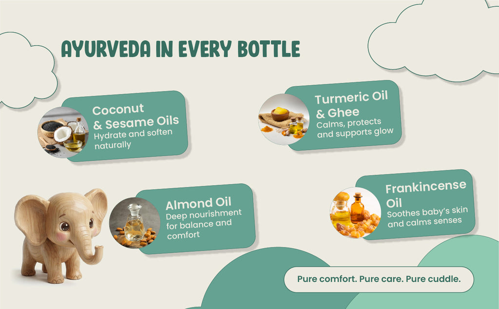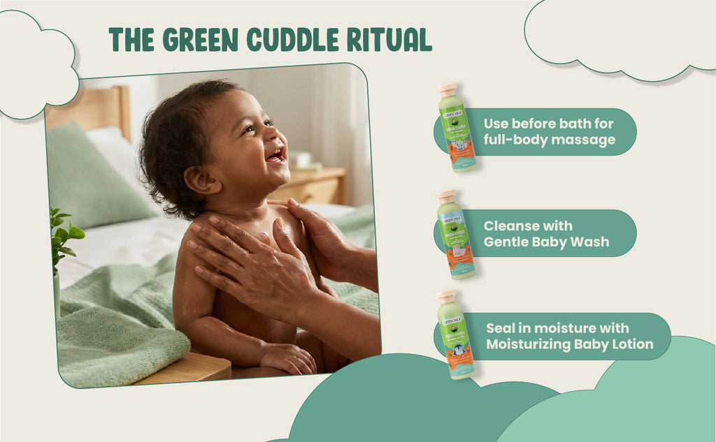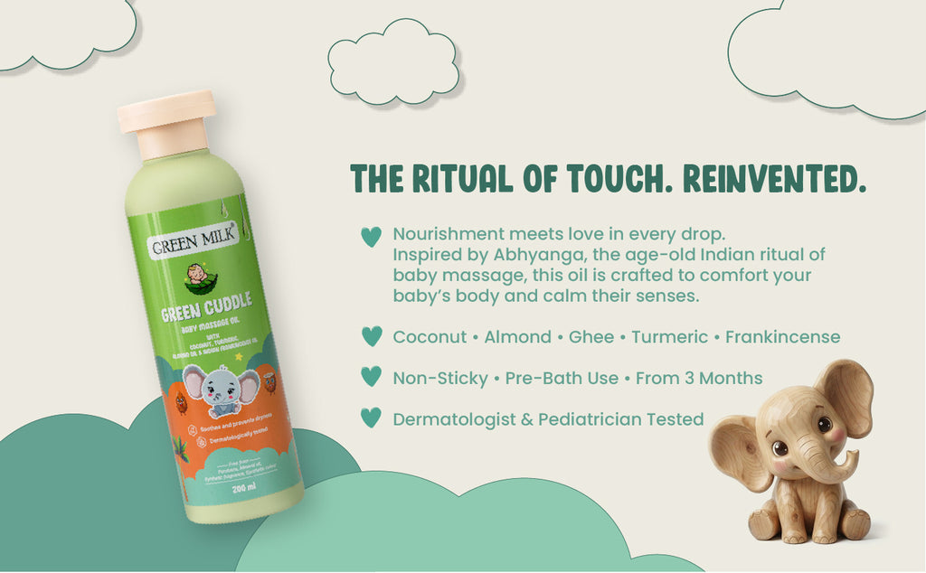 Green Cuddle Baby Massage Oil is crafted for Indian babies and Indian parents who believe in safe, natural, and time-tested care. Rooted in Ayurveda, this ayurvedic baby oil blends coconut oil, sesame oil, almond oil, ghee, turmeric, and Indian frankincense to support healthy, soft, and well-nourished baby skin.