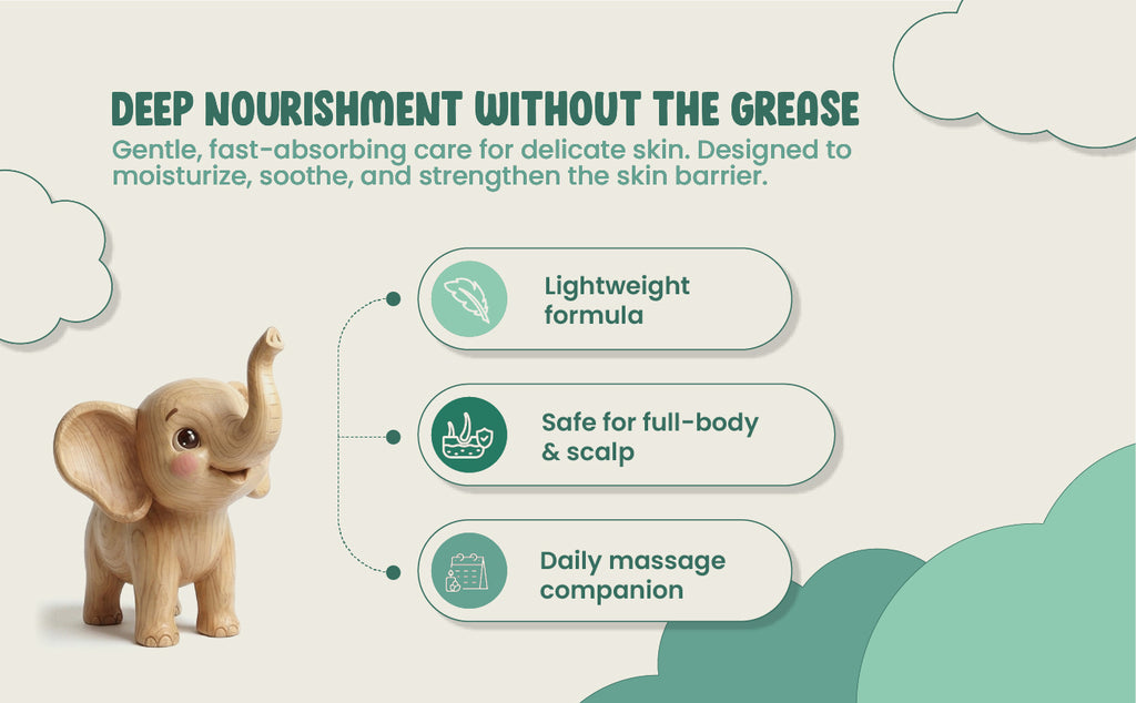 Regular daily baby massage oil use helps maintain skin moisture, improves skin smoothness, and strengthens the parent-baby bonding ritual. The oil absorbs quickly, making it ideal as a non-sticky baby body oil for full-body and scalp massage.