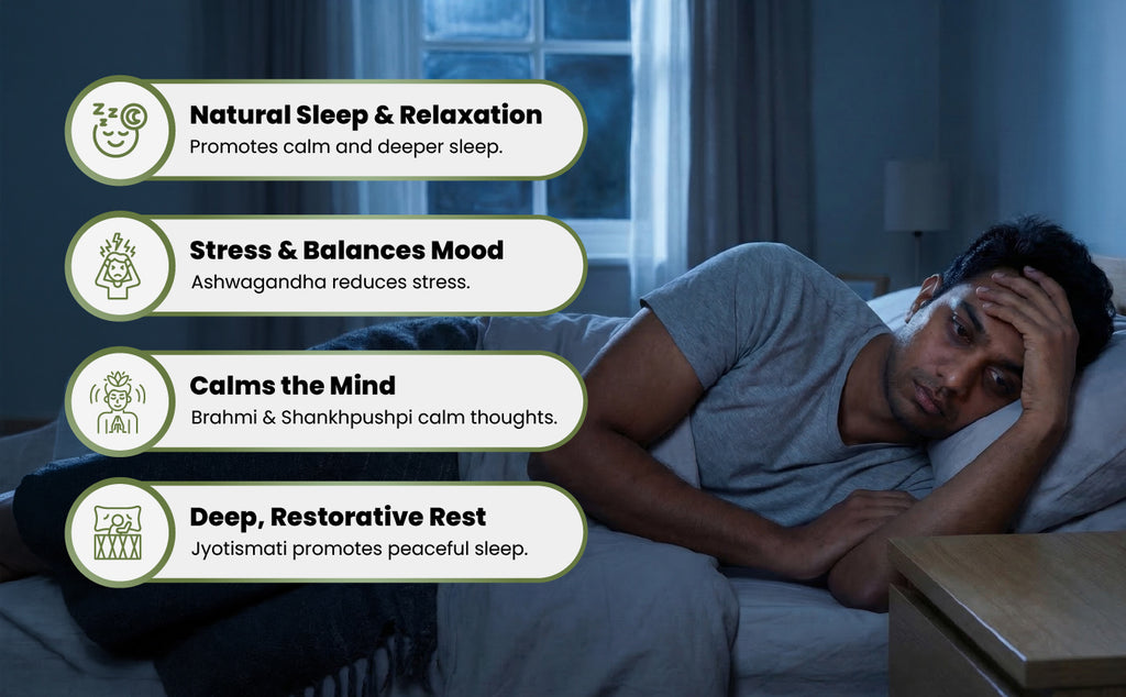 Tagara supports natural sleep onset, Ashwagandha helps ease stress, and Brahmi–Shankhpushpi support mental clarity and emotional balance. Jyotismati calms a restless mind, making it easier to drift into deeper, refreshing sleep.