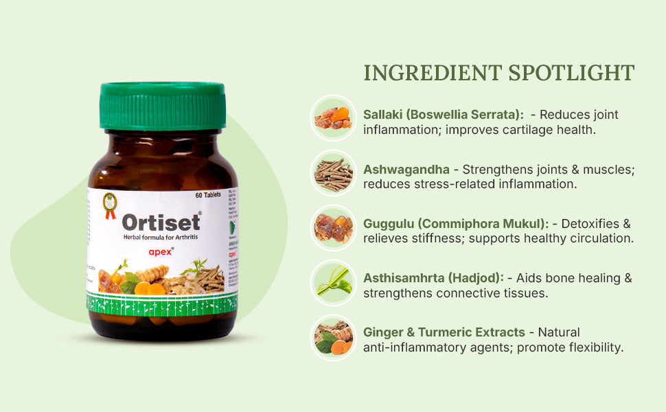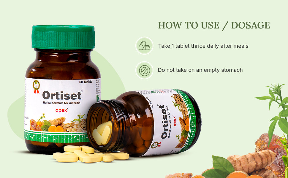Ortiset Tablets are crafted from time-honored Ayurvedic herbs known to support relief from joint pain, swelling, and stiffness associated with conditions like rheumatoid arthritis.