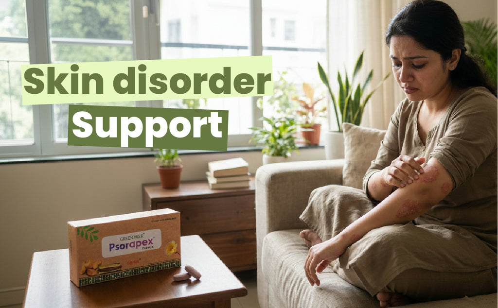 Psorapex Tablets by Green Milk Concepts is a gentle Ayurvedic formulation designed to support skin wellness through internal balance and cleansing. Ayurveda considers long-term skin discomfort to be linked with internal imbalances rather than surface-level concerns. This formulation follows Ayurvedic principles to help maintain balanced skin responses and overall wellbeing.